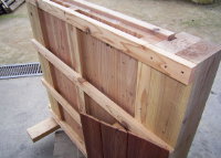 板倉構法の外壁は30mm厚の杉板の片面に24mm厚の木摺りを直交に張り合わせます。このことで剛性が高まり、平成17年9月、地震の揺れに対する壁の強度を表す「壁倍率」が基準値の2.2倍という木造住宅では高い評価の性能認定を国土交通大臣から取得しました。